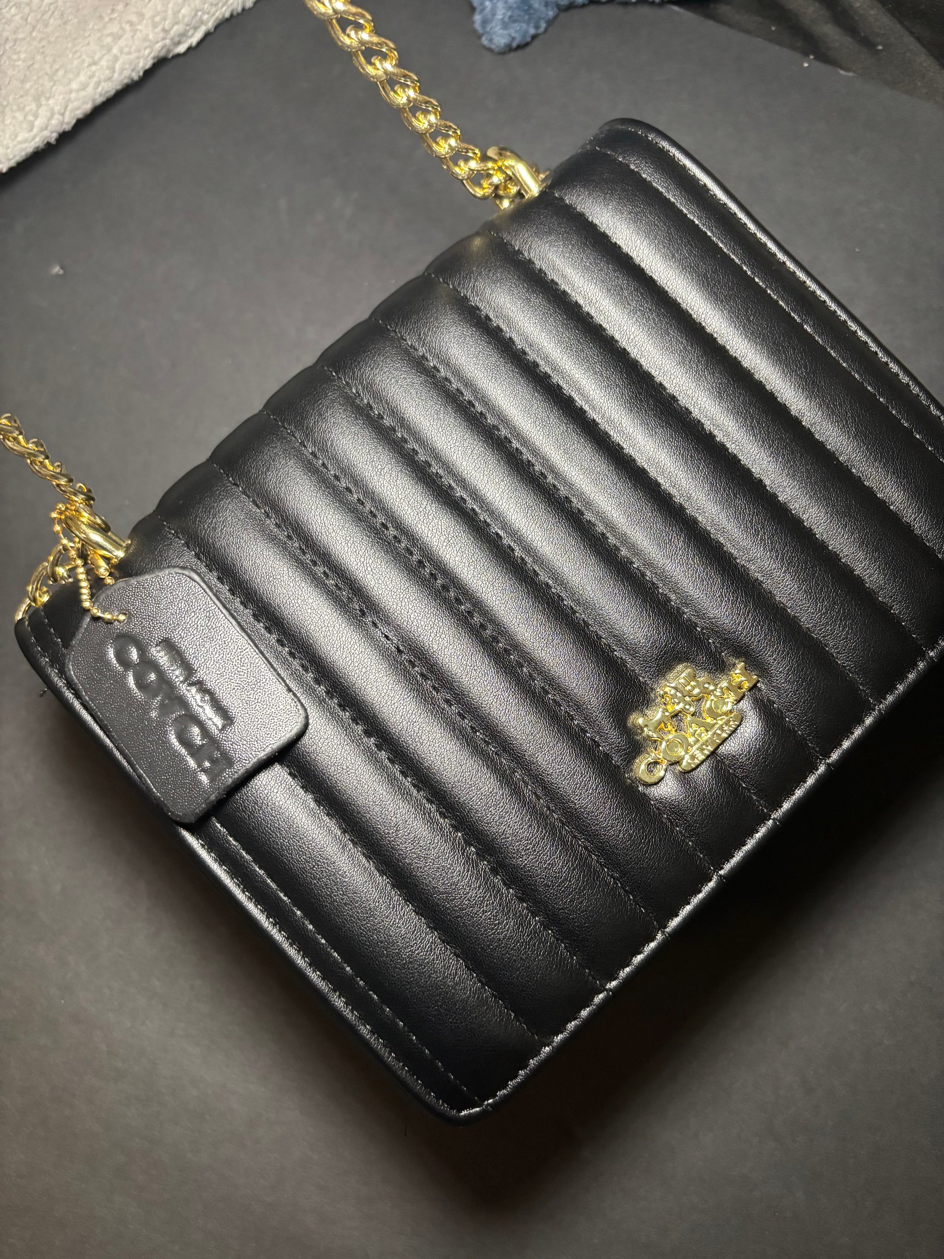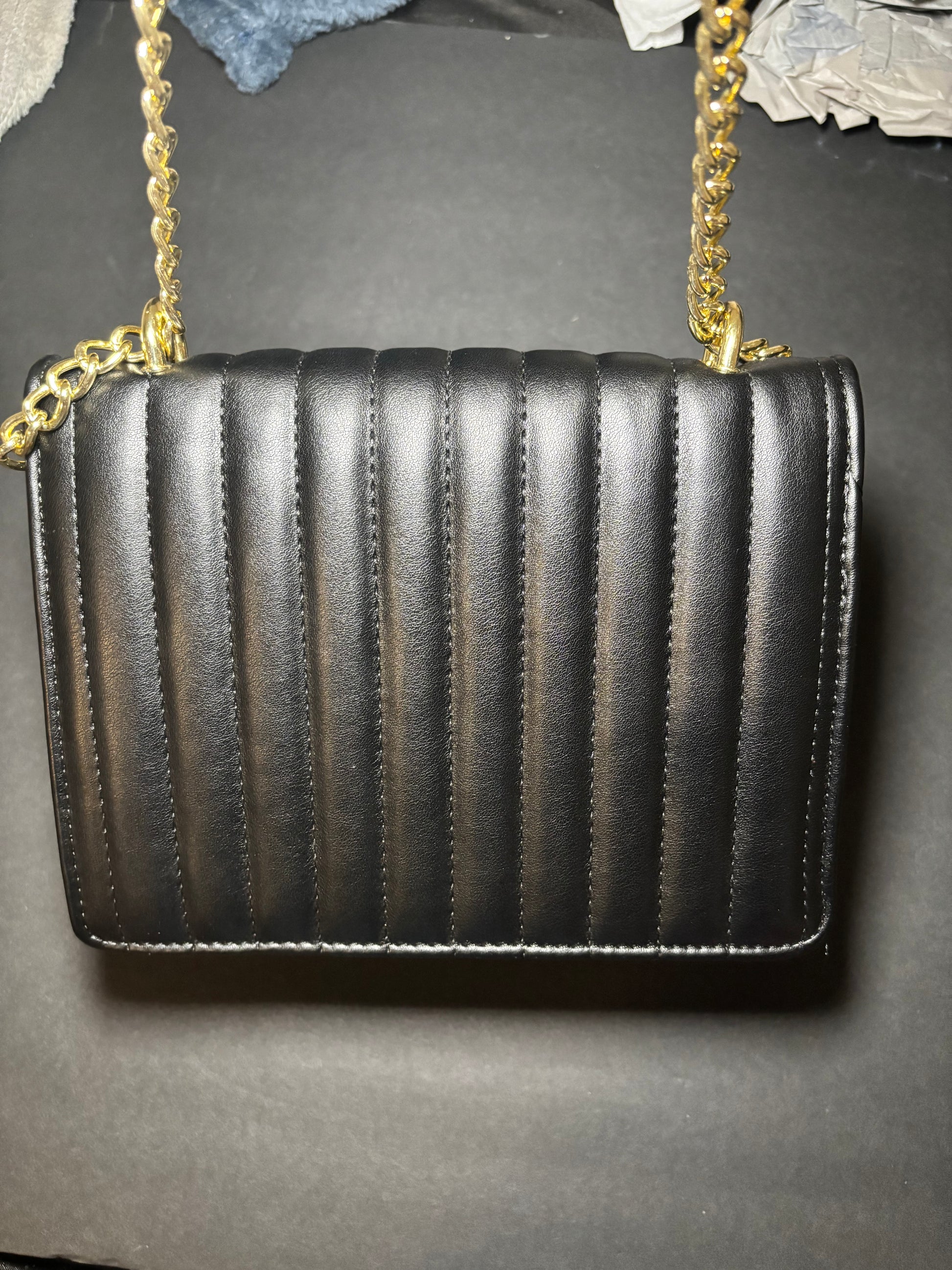 Black quilted faux leather with gold chain detail—an elegant statement for any occasion.